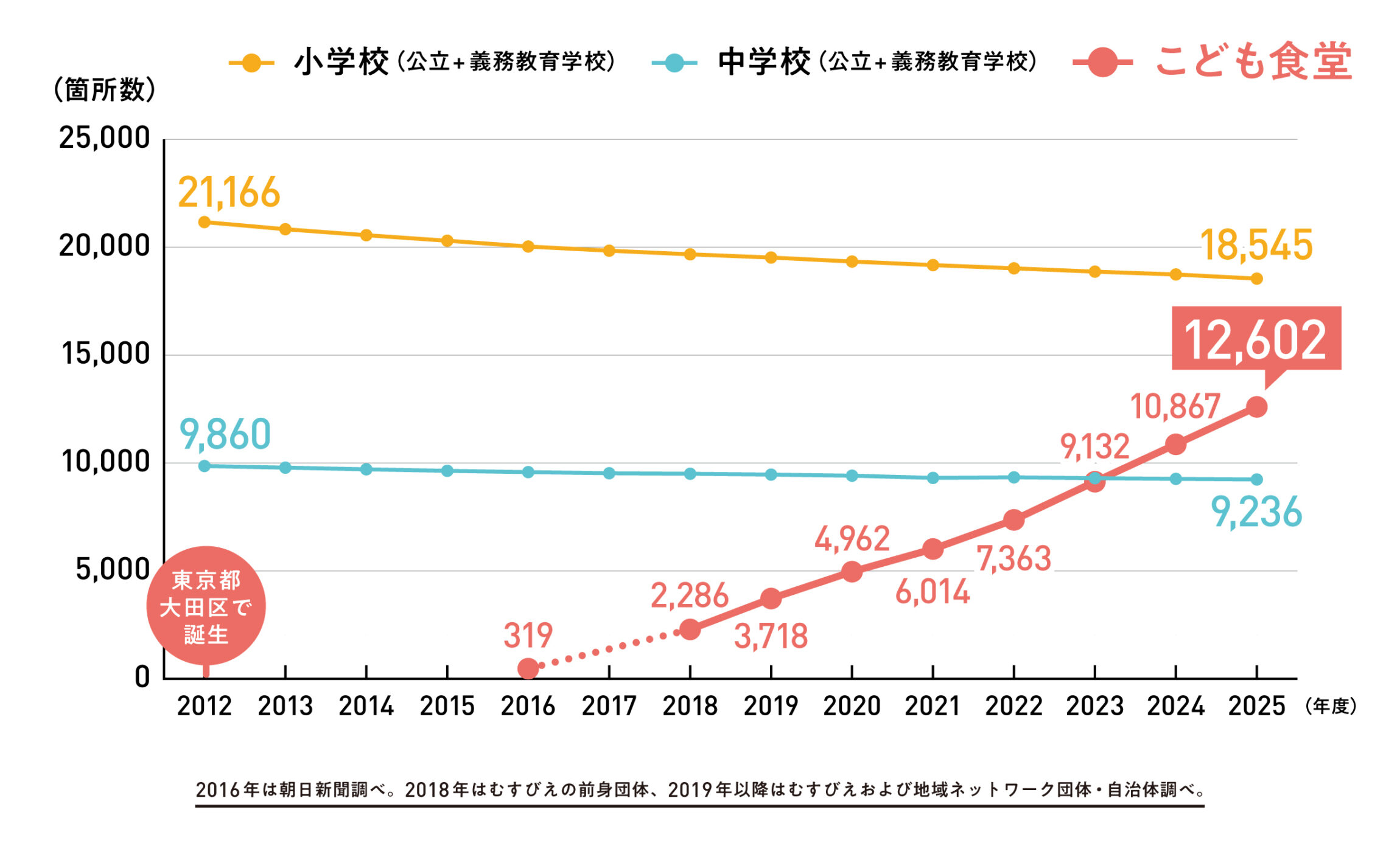 2024年度の調査では、全国のこども食堂が昨年度から1,735カ所増え、「10,867カ所」となり、全国の公立中学校と義務教育学校の数を合わせた9,265カ所を超える結果となりました。