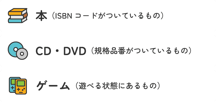 読み終わった本・CD/DVD・ゲームなど、ご自身で使わなくなったモノ。