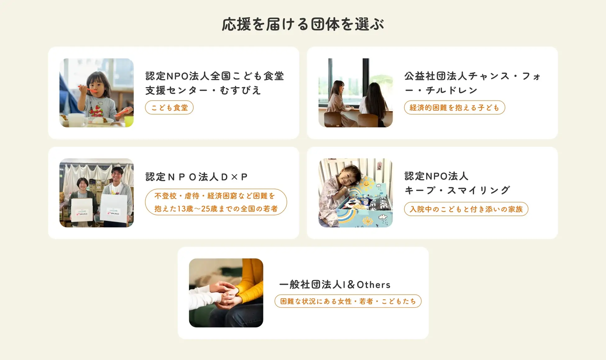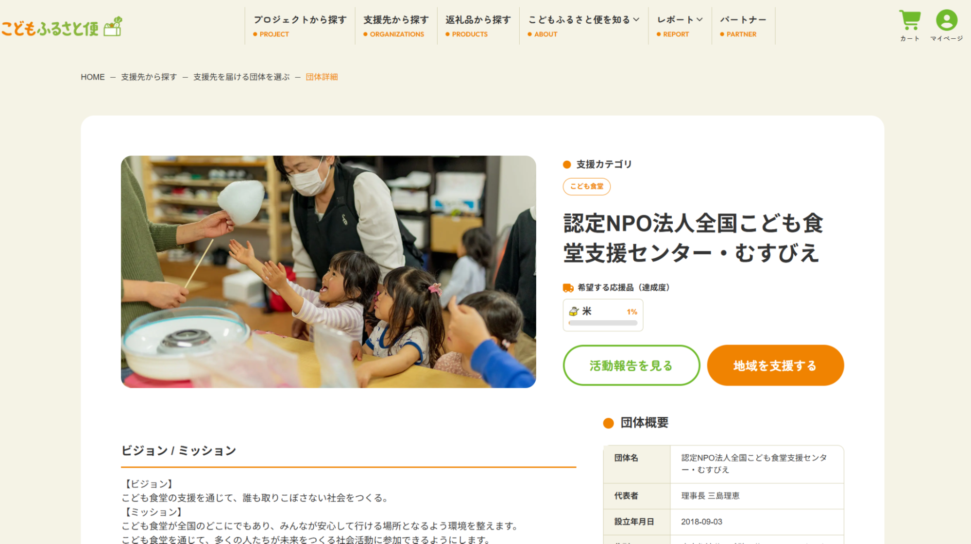 同社が2025年10月14日に開設した、寄付者が応援品の届け先の地域や団体を指定できる専用ポータルサイト上において、寄付先団体の一つとして「むすびえ」を選択することができます。ご指定によりいただいたご寄付は、全国のこども食堂の活動を支えるために活用させていただきます。