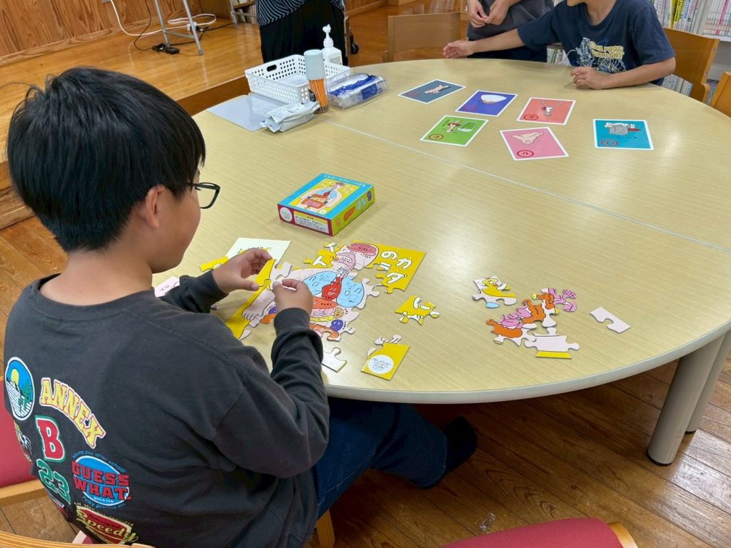 「かむことの大切さ」についての講話では子ども17名と保護者5名に参加いただき、かむことの8大効果についてお伝えすることができました。その後、パズルやすごろく、カルタ、神経衰弱などの食育教材を使って遊びながら、体や食について学べる時間になりました。