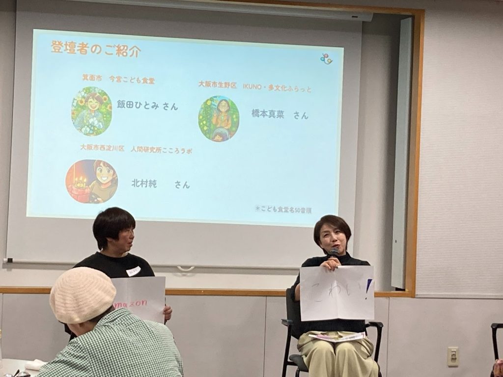 第一部では、むすびえからの最近の活動のご報告に続き、大阪府内でこども食堂を運営されている3名にお越しいただき、それぞれのこども食堂でのエピソードをご紹介いただきました。