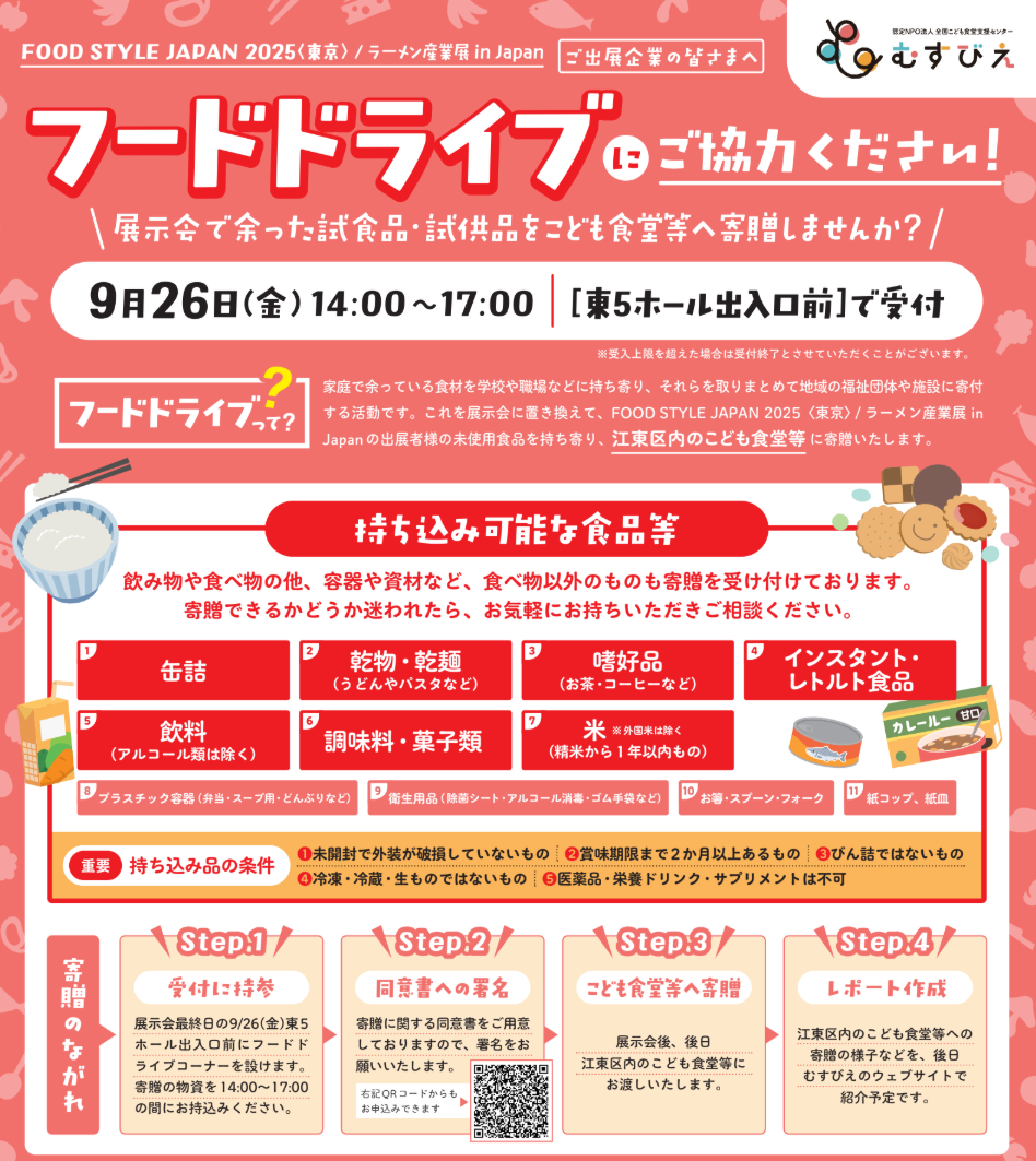 この度、FOOD STYLE JAPAN 2025 <東京> /ラーメン産業展 in Japan にて、主催者企画としてフードドライブコーナーを設置いただき、むすびえがコーナー運営を行いました。