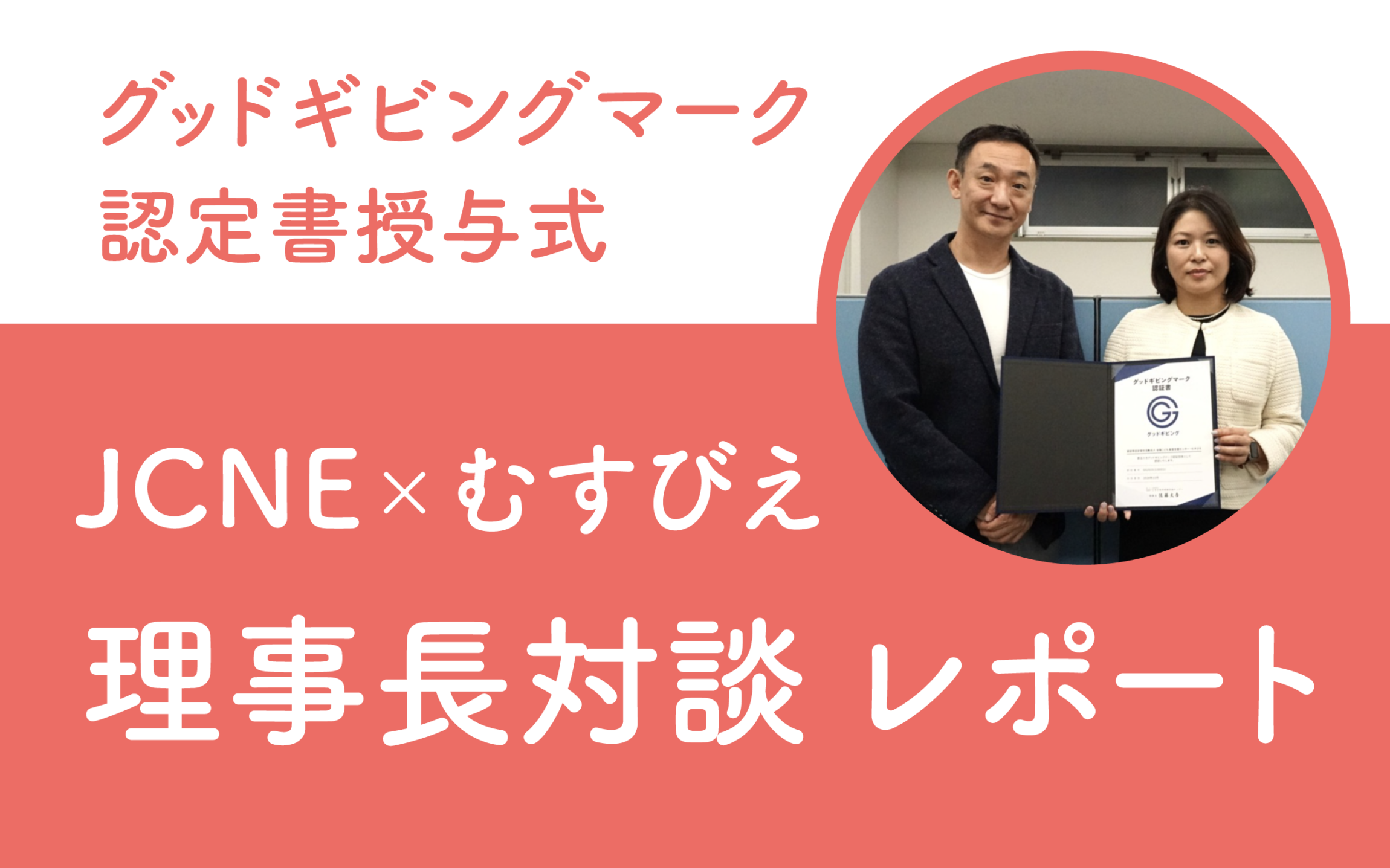 むすびえは公益財団法人日本非営利組織評価センター(略称:JCNE、以下「JCNE」)が運営する第三者認証制度グッドギビングマークを取得し、認証書授与式にて理事長の三島理恵が受領いたしました。