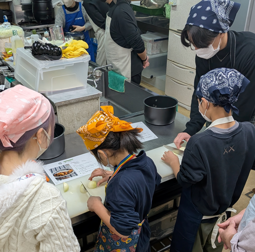 メニューは子どもたちの大好きな「カレーライス」!まずは下ごしらえからスタートです。玉ねぎ、にんじん、じゃがいもなどの野菜を、子どもたちが包丁を使って一生懸命カットしました。シロカの社員さんや大人たちに見守られながら、慣れない手つきでも丁寧に取り組む姿がとても印象的でした。