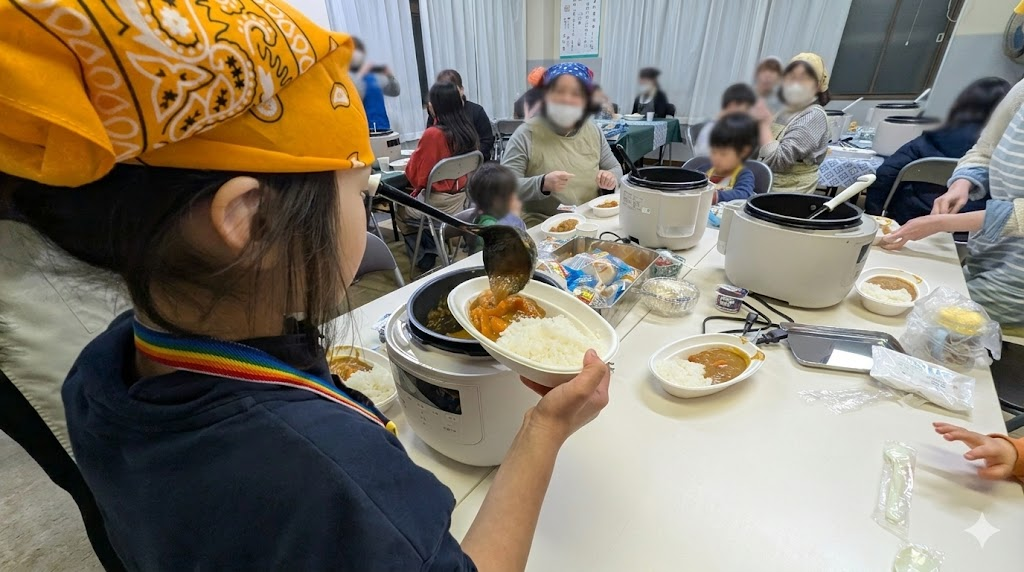 圧力が下がり、カレールーを混ぜて温め直せばカレーの完成です!自分たちで作ったカレーを、大きなお玉を使って上手にお皿に盛り付けていきます。