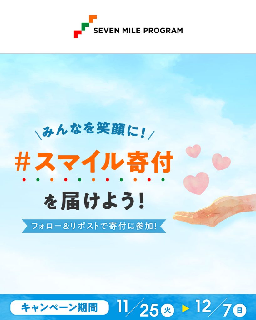 通常のセブンマイルプログラムでのご寄付に加えて、期間限定での寄付キャンペーン「スマイル寄付キャンペーン」が今年も始まります!