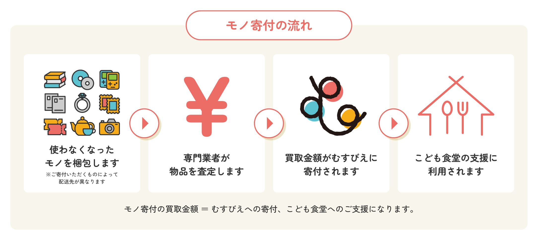 「モノ寄付」とは、ご自宅やオフィスに眠るモノ(本やDVD・切手・はがき・貴金属など)をお送りいただき、その買取金額(お金)がむすびえに寄付される仕組みです。