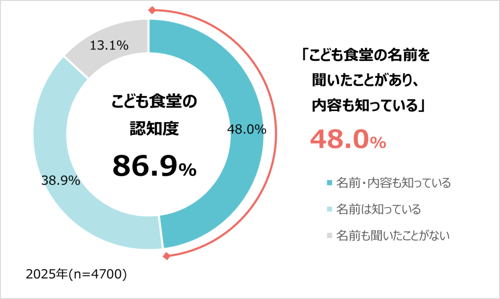 一方、こども食堂の「内容も知っている」と回答した人は48.0%にとどまり、「名前を聞いたことはあるが、内容は知らない」という人が38.9%。「名前も聞いたことがない」という人が13.1%いました。