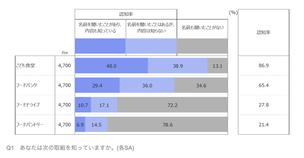 今回の調査では、こども食堂に関連する取り組みの認知(名前を聞いたことがある)は、「こども食堂」が86.9%。「フードバンク」は65.4%、「フードドライブ」は27.8%、「フードパントリー」は21.4%でした。