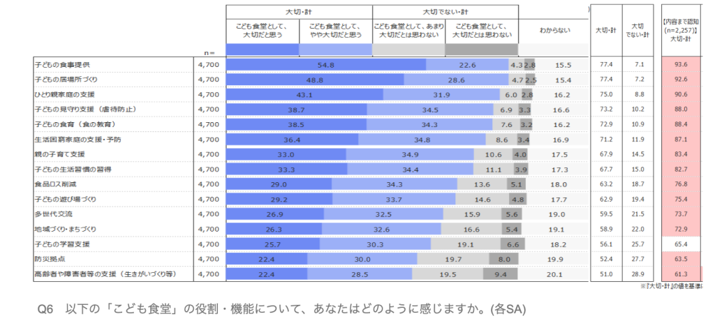 また、こども食堂の役割・機能のイメージで大切だと思うことでは、「子どもの食事提供」と「子どもの居場所づくり」が最も重視されていると同時に、「ひとり親家庭の支援」や「子どもの見守り支援(虐待防止)」も大切な役割であるとイメージする人が多いことがわかりました。