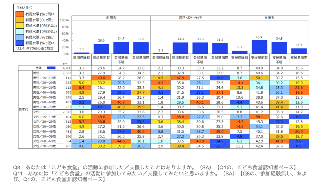 こども食堂への参加状況については、利用者として参加したことがある人が3.1%、運営者やボランティアとして参加したことがある人が2.2%、支援者(寄付者)として活動に参加したことがある人が8.7%でした。属性別では、男性20代〜40代、女性20代〜30代と子育て世代にあたる年代で参加経験が比較的高い傾向があります。特に支援(寄付)経験は男女とも20〜30代で高め(約13〜14%)で、約7〜8人に1人が支援したことがある計算になります。