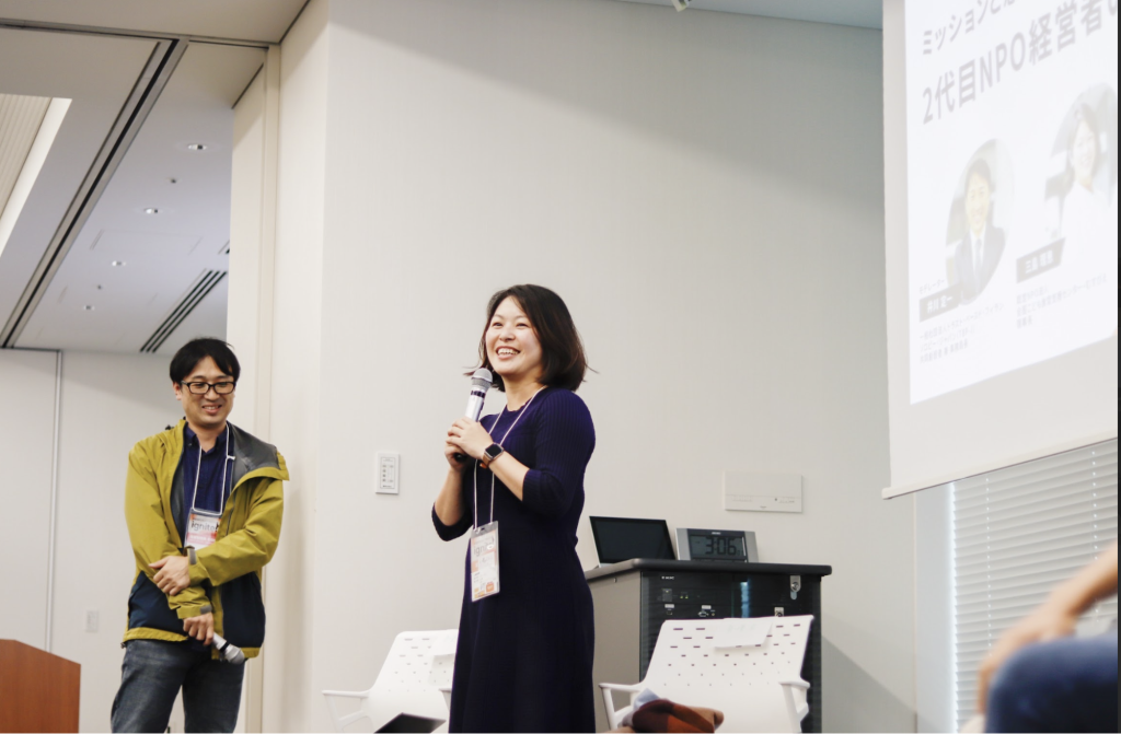 また、テーマ別セッションでは、「ミッションと志を継ぐ2代目NPO経営者の叙事」に登壇させていただき、創設者の湯浅から理事長を受け継いだことにまつわる、具体的な決定プロセス、三島自身の一連の心の変化、葛藤、まわりからの応援、励ましなど、ざっくばらんにお話しさせていただきました。