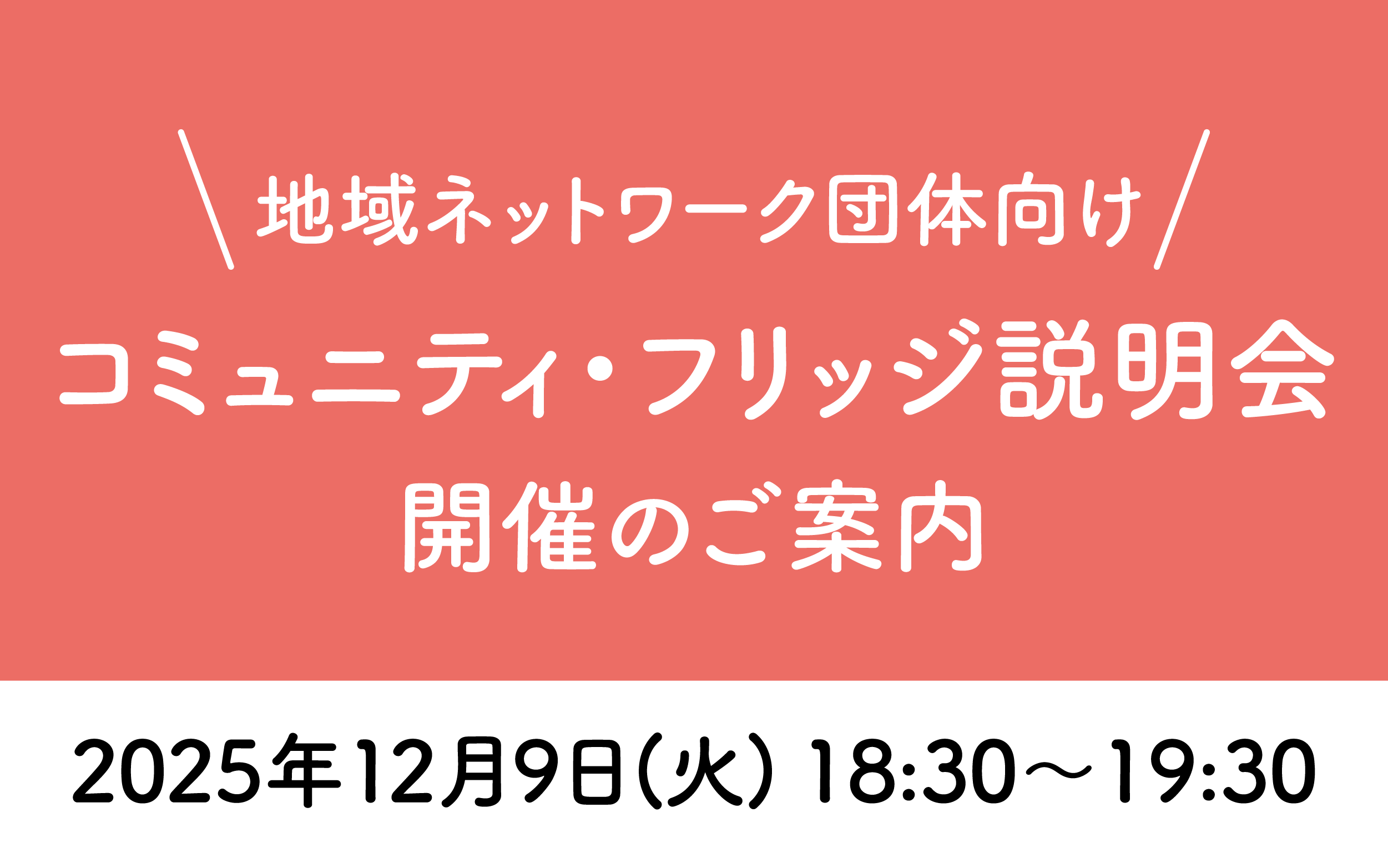 今回の説明会では、「コミュニティ・フリッジ」の基本的なしくみ、導入のステップ、運営のポイント、ネットワークとしての展開可能性などを整理し、こども食堂を対象としたコミュニティ・フリッジの導入に興味をお持ちの団体・組織を対象にお話しさせていただきます。