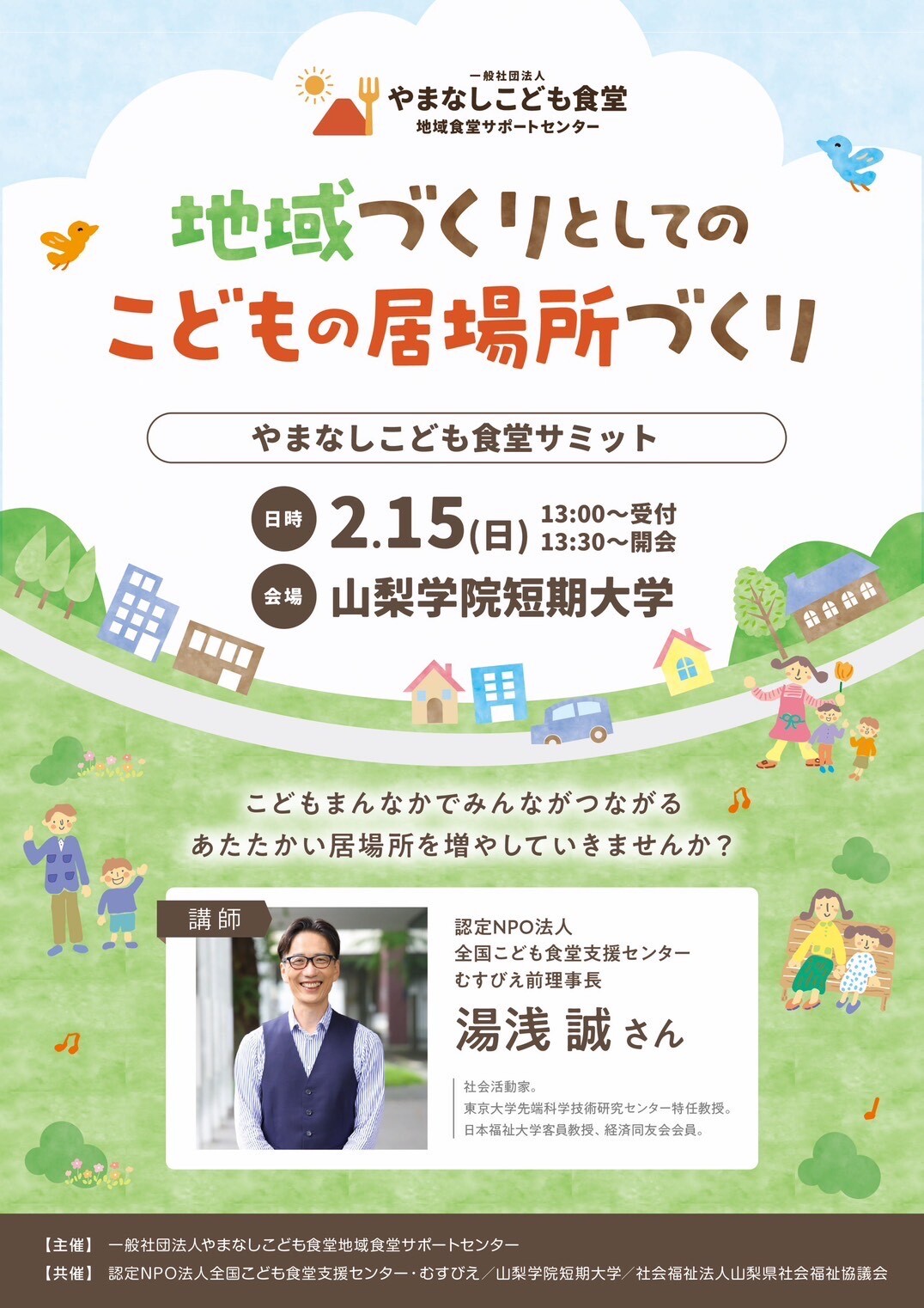 山梨県内で活動されている「こども食堂」「地域食堂」の運営者の皆さまを対象に、2月15日(日)に「やまなしこども食堂サミット」を開催いたします。