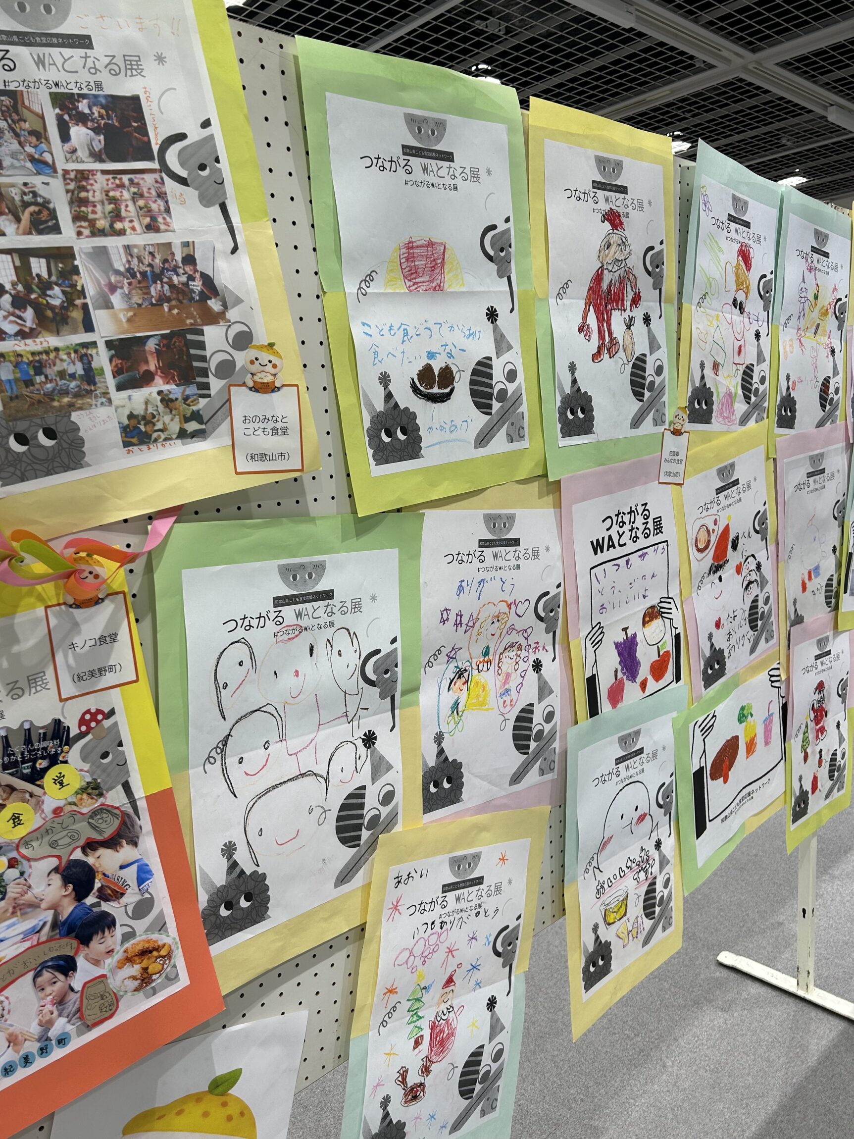 同時に開催された和歌山こども食堂「つながるWAとなる展」は、こども食堂と支援する企業が「ありがとう」を伝え合うことで、地域全体にありがとうの循環が生まれることを目指した取り組みで、子どもたちから企業への「ありがとう」を表現した絵やメッセージカードが、壁一面に張り出されました。