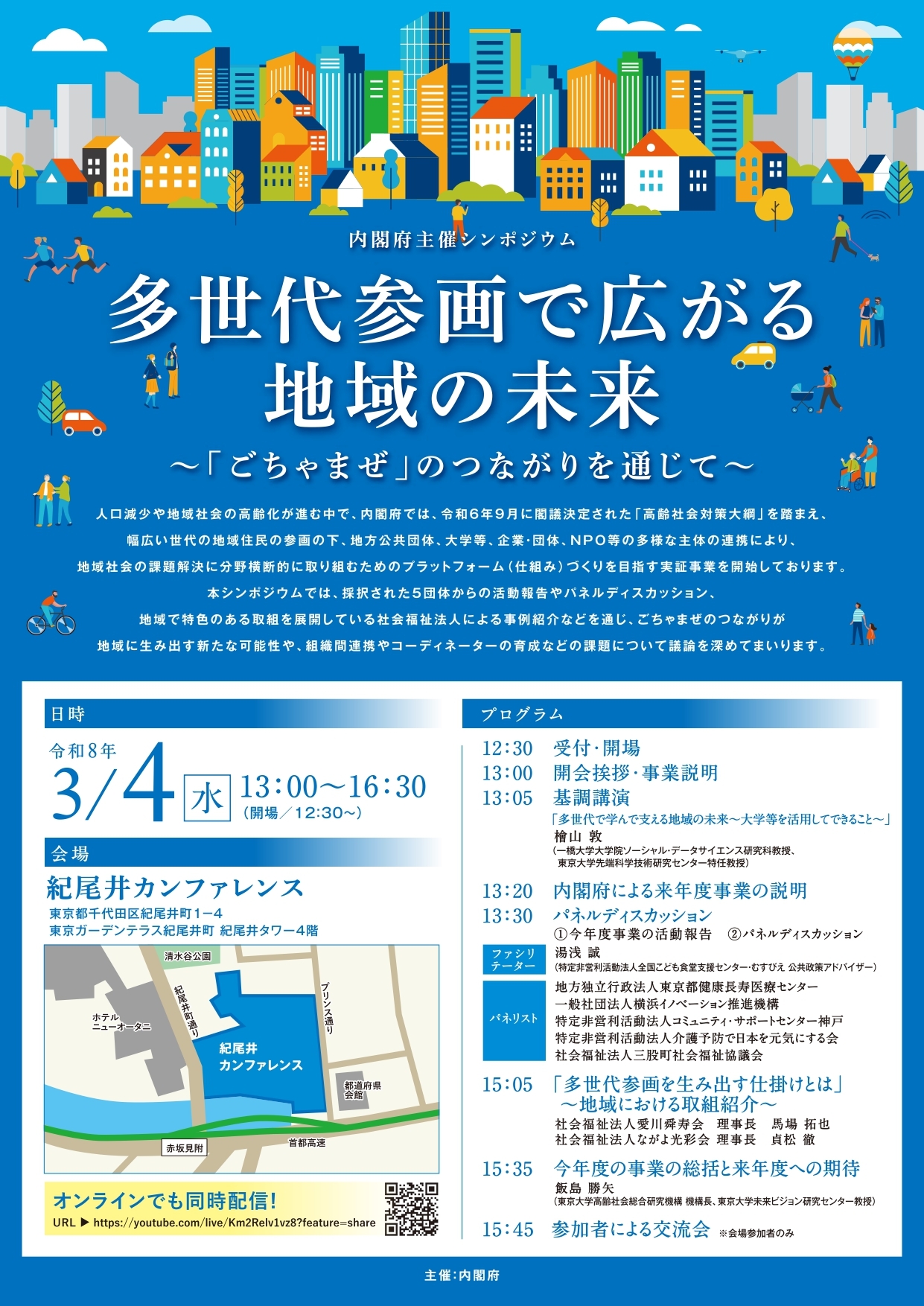 このたび、内閣府が主催するシンポジウム「多世代参画で広がる地域の未来~「ごちゃまぜ」のつながりを通じて~」が開催されます。